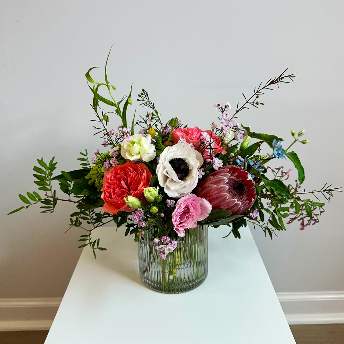 While each design is one of a kind, we guarantee seasonal flowers of equal or greater value, and vases that are similar to those pictured. We are committed to providing fresh, premium blooms in every arrangement.